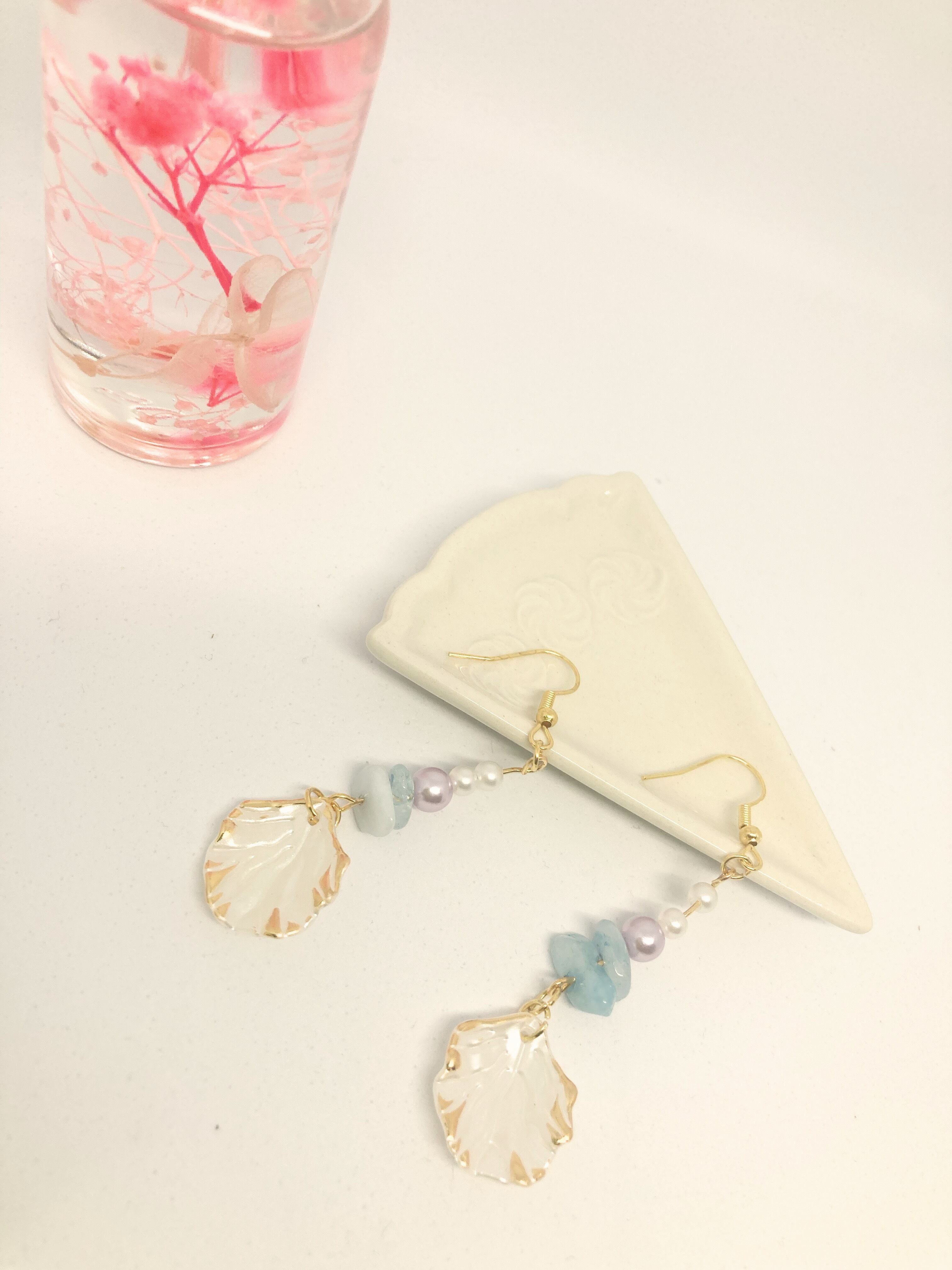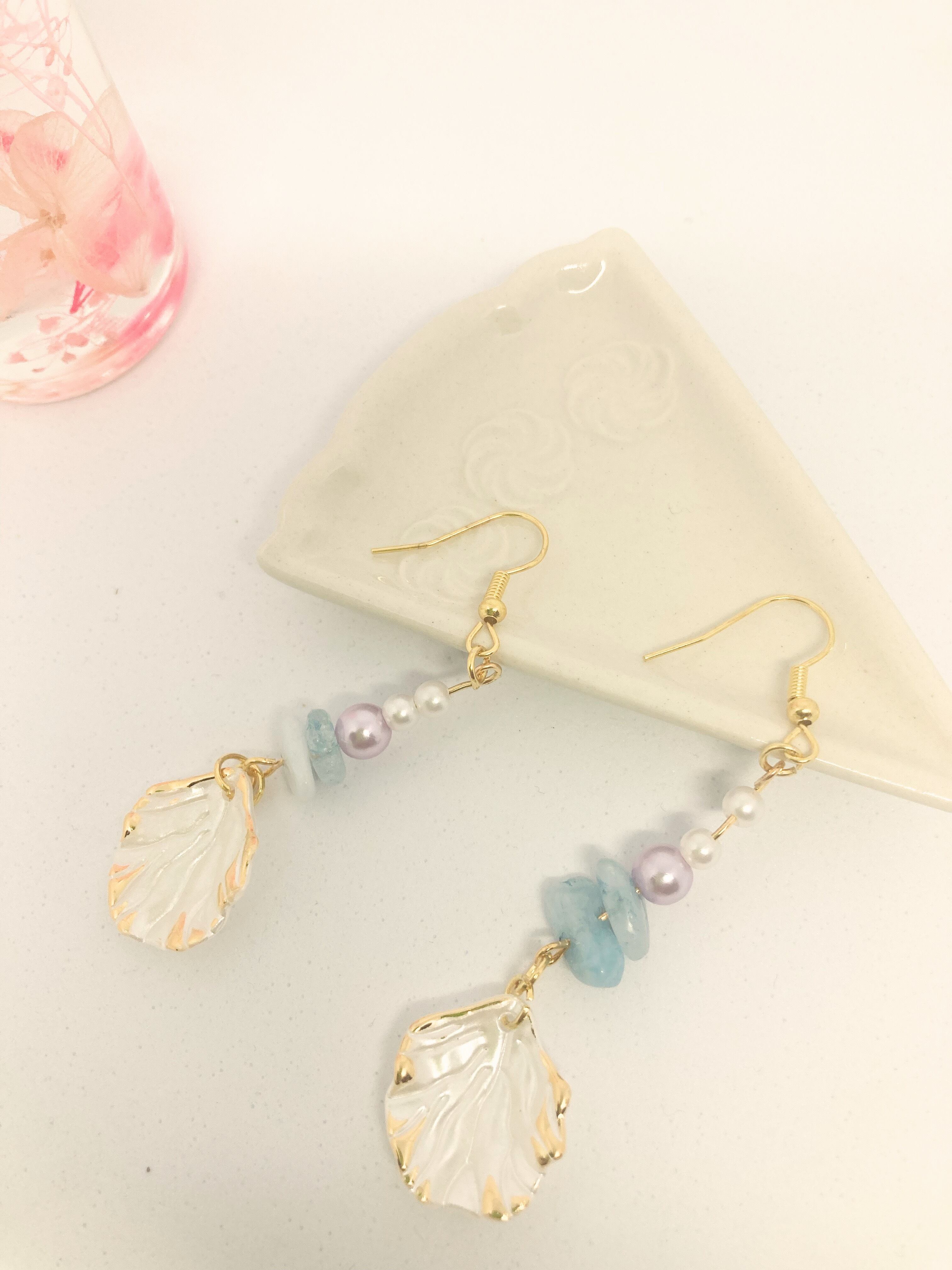 美しい海をイメージさせるアクアマリンと貝殻チャームのピアス。透明感のあるアクアマリンが涼やかな印象を与え、貝殻チャームがさりげなくアクセントを添えています。どんな洋服にも合わせやすく、日常使いから特別な場面まで幅広くお楽しみいただけます。